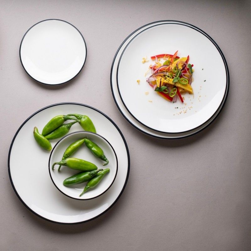 Фарфоровая тарелка 25см, подходит для подачи горячих блюд, белая тарелка с черной каймой от бренда ID Fine. Выполнена из профессионального ресторанного фарфора, отличается прочностью и стильным минималистичным дизайном, легко штабелируется. Универсальный выбор для кафе, ресторанов и гостиниц. Входит в базовую коллекцию Modest. Есть пожизненная гарантия от сколов.