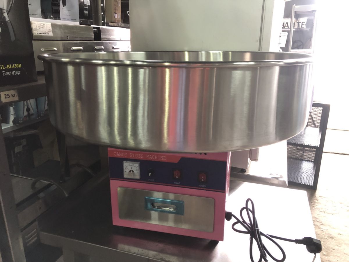 Состояние товара : новый; Причина уценки : выставочный образец; Питание : 220 В; Мощность : 0,9 кВт; Тип : для сахарной ваты ; Установка : настольная ; Производительность : до 3 кг/ч ; Габаритные размеры : 730х730х500 мм;