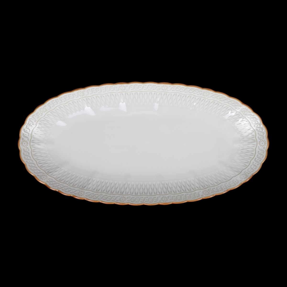 Тип посуды: блюдо; Серия: Corone Cinzano; Материал: фарфор; Форма: овальная; Основной цвет: белый с оттенком; Размер, мм: 360х180х35; Особенности: рельефный узор;