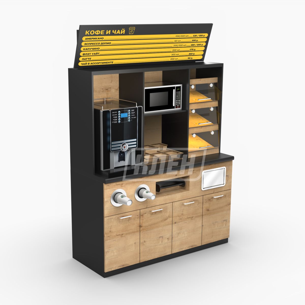 Габаритные размеры (ШхГ): 1500х600 мм; Декоры : фото складской программы размещены ниже; Высота : 1800 мм – без вывески, 2200 мм – с вывеской; Тумба : с нишами для хранения, лючком для мусора, держателем рулонных пакетов, с полкой для микроволновки и модулем для выпечки; Петли : с доводчиками ; Кромление : промышленное; Материал столешницы : постформинг с пластиком Slotex 40 мм, (арт.днв005) ; Материал : Каркас тумбы и купола ЛДСП 16 мм., крыша 32 мм. кромка 1 мм ; Материал модуля для выпечки : ЛДСП, акриловое стекло;