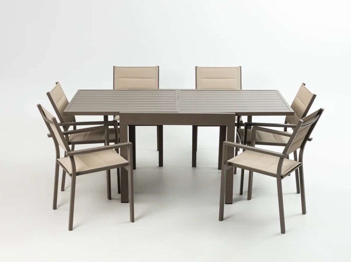 Стол раздвижной (ШхГхВ) : 900/1800х900х750 мм ; Кресло (6 шт) (ШхГхВ) : 550х590х860 мм ; Материал каркаса : алюминий с порошковым покрытием ; Материал сиденья : текстилен с поролоном внутри ; Цвет каркаса : коричневый ; Цвет текстилена : белый ; Максимальная нагрузка кресла : до 150 кг ; Вес комплекта : 45 кг;