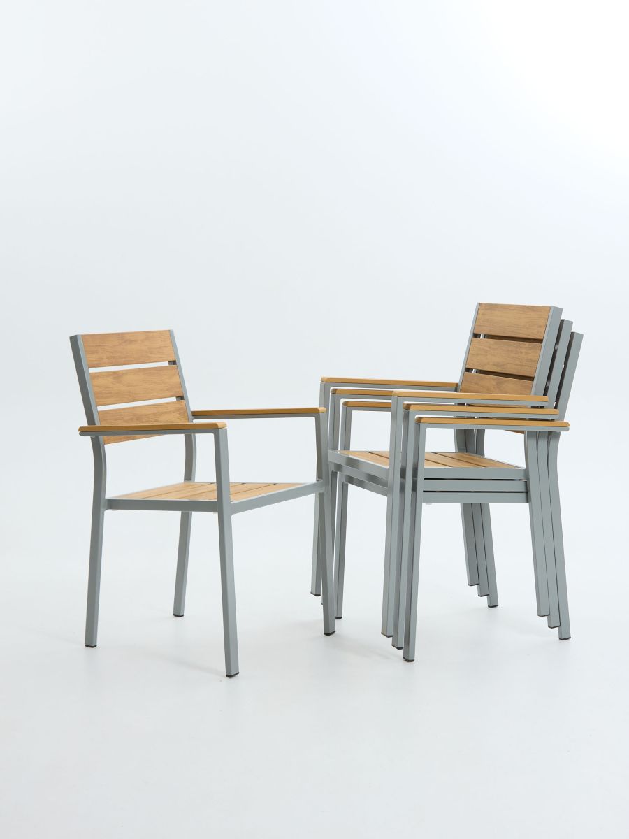 Габариты (ШхГ) : 550х560 мм ; Высота : 870 мм ; Материал сиденья и спинки : поливинилхлорид (пластик с имитацией дерева) ; Материал каркаса : алюминиевая трубка с порошковым покрытием, передняя ножка с усиленной линией внутри, задняя трубка ; Вес : 5 кг;
