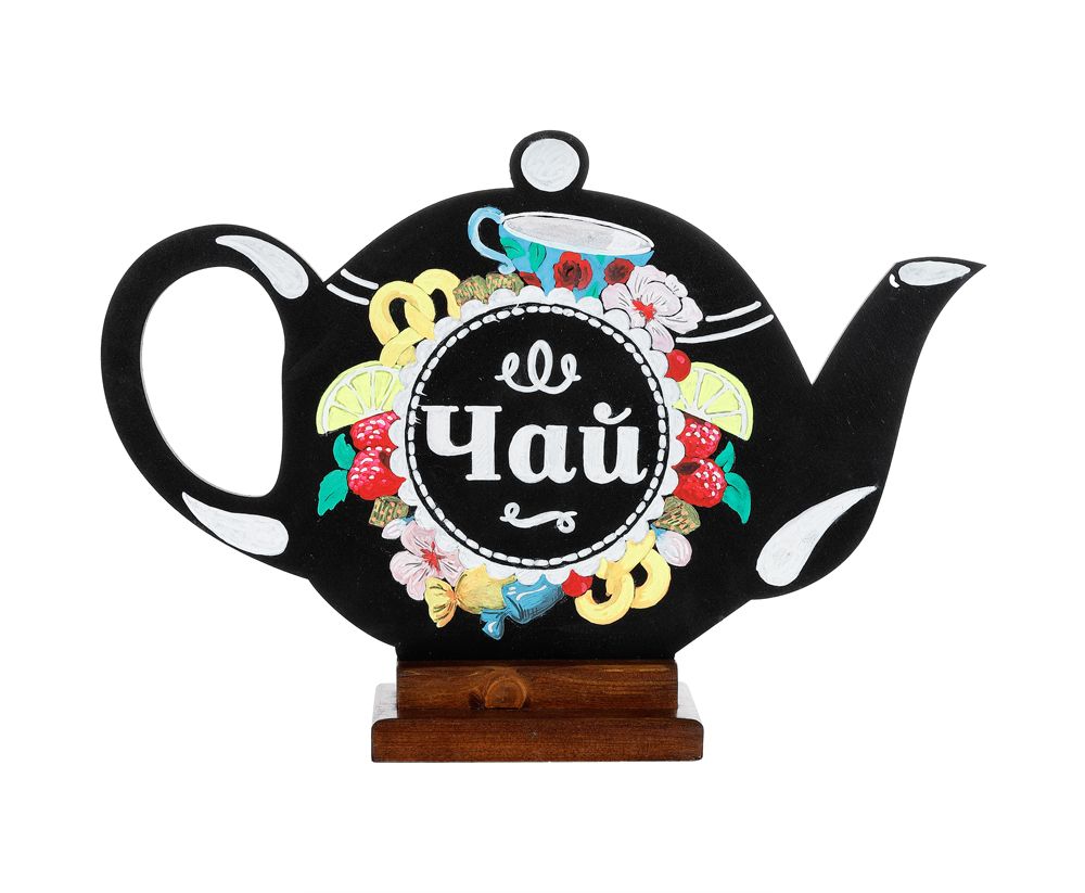 Меловая доска «Чайник» 380х245 мм на деревянной подставке с росписью