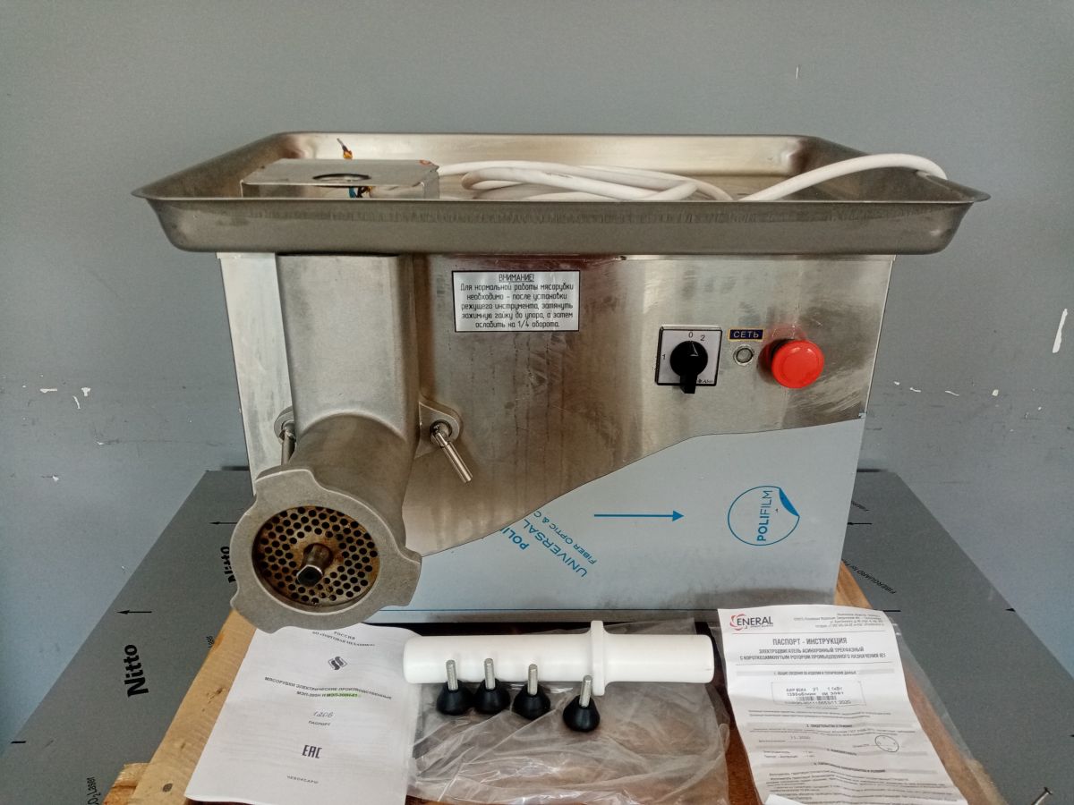 Состояние товара : новый; Причина уценки : Уценка, без упаковки; Производительность : 300 кг/ч ; Частота вращения шнека : 200 об/мин. ; Набор ножей и решеток : полный унгер ; Реверс : да; Напряжение : 380 В ; Потребляемая мощность : 1.1 кВт ; Габаритные размеры : 570х532х428 мм; Вес : 46.9 кг ; Страна производства : Россия;