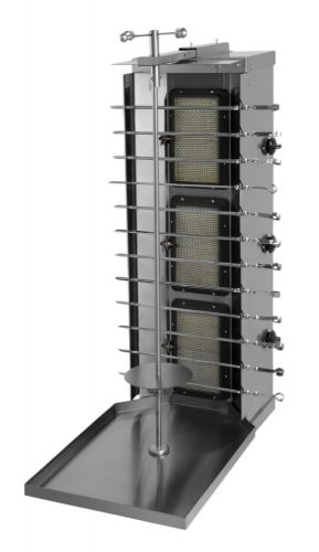 Питание: газ; Мощность, кВт: 11; Привод: ручной; Количество зон нагрева: 3; Длина вертела, мм: 990; Максимальная загрузка, кг: 80; Приготовление на шампурах: Да; Габаритные размеры, мм: 515х800х1170;