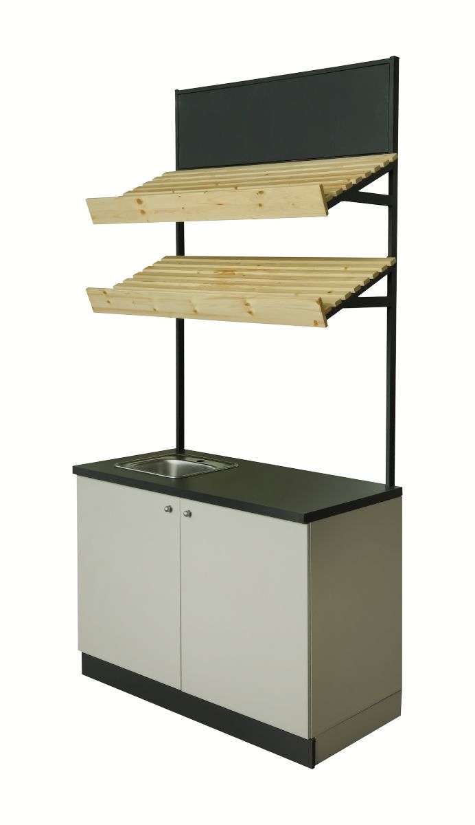 Габариты: 1200х600х2100 мм; Фурнитура: ведущих мировых производителей; Материалы: корпус ЛДСП толщиной 25 мм, металлокаркас 40х40 мм, меловая доска, столешница ДСП, облицованная пластиком 32 мм, фасад ЛДСП толщиной 16 мм, полки массив сосны; Цвета корпуса: кашемир серый, металлическая труба сечение 40х40 мм, черный; Цвет столешницы: черный графит; Мойка: нержавеющая сталь.;