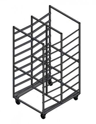 Количество уровней: 9; Размер противней/подносов: 750х450х120; Материал: металл, окрашенный полимерной краской; Вместимость: 18 лотков для хлеба (750х450х120 мм); Каркас: Сварной; Тормоза на колесах: Да; Габаритные размеры, мм: 950х785х1700;