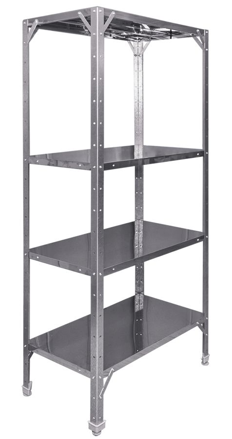 Материал каркаса: оцинкованная сталь; Форма каркаса: уголок; Материал полок: Нерж. сталь AISI 430; Количество полок: 4; Ширина, мм: 1 200; Глубина, мм: 400; Высота, мм: 2 000;