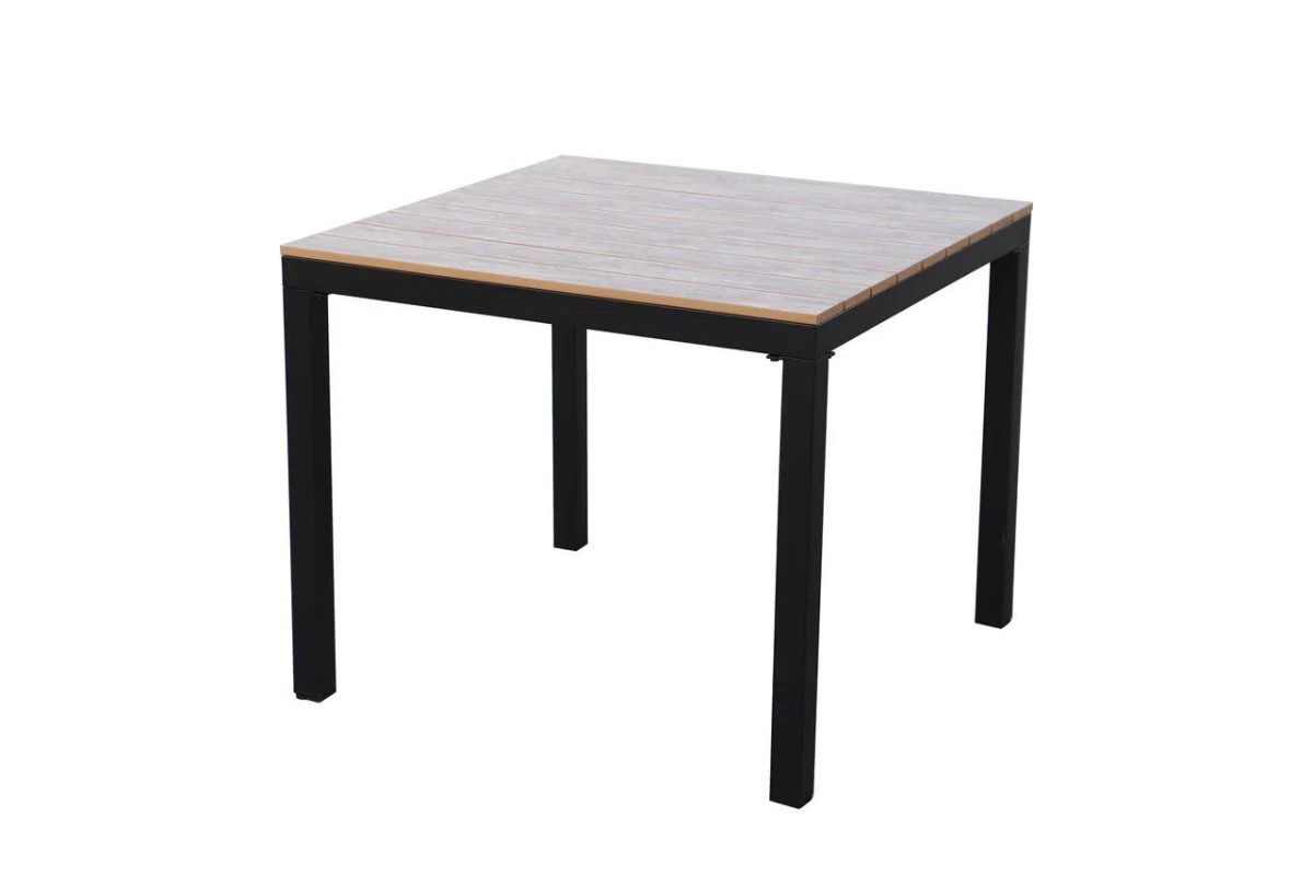 Стол (ШхГхВ) : 890х890х735 мм; Материал каркаса : стальная труба 50х50 мм, толщиной 1,5 мм; Материал столешницы : полимерная доска под тиковое дерево, толщина 20 мм; Цвет каркаса : черный; Вес : 18,5 кг;