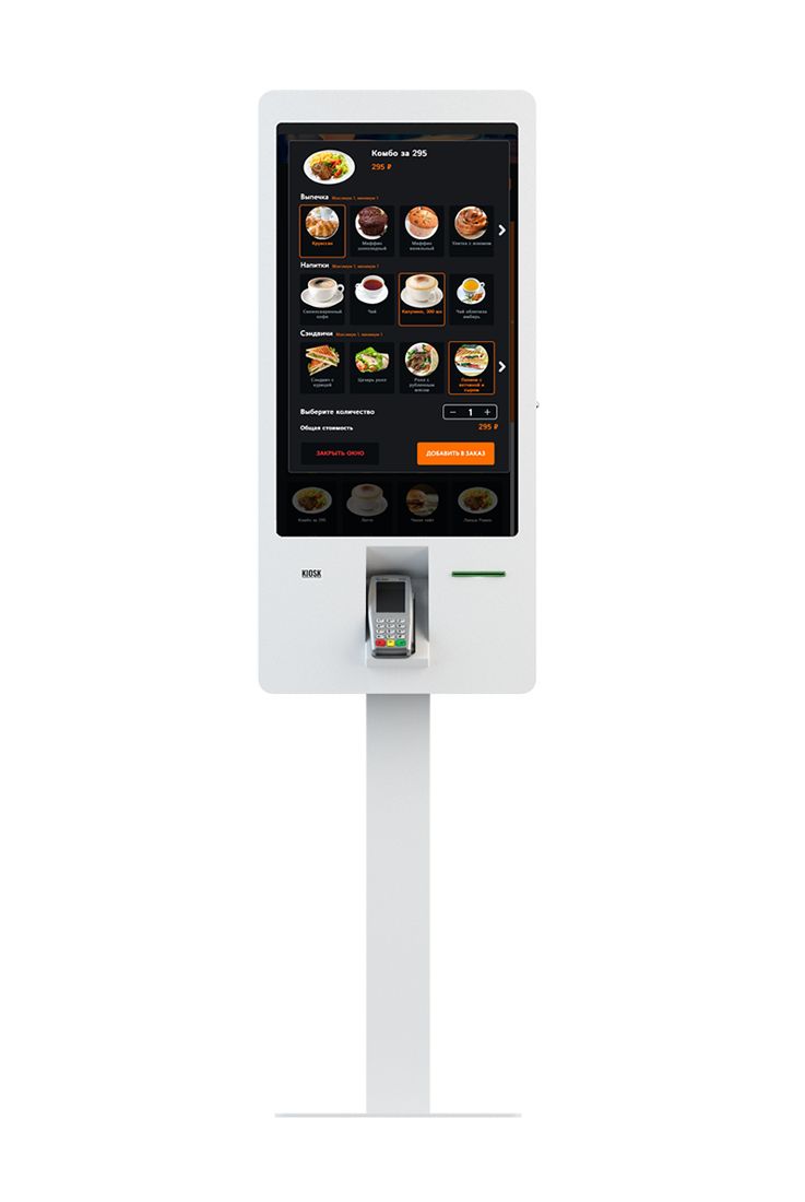 Управляющий̆ компьютер : Corei3-7100U, DDR4 SO-DIMM 4 Gb, SSD 60 Gb; Операционная система : лицензия на ОС Windows 10 IoT; Диагональ и разрешение монитора : 31,5’’, FHD 1920x1080; Технология сенсора : проекционно-емкостной (PCAP); Яркость монитора : 350 кд/м2; Чековый принтер : CustomVKP-80III;